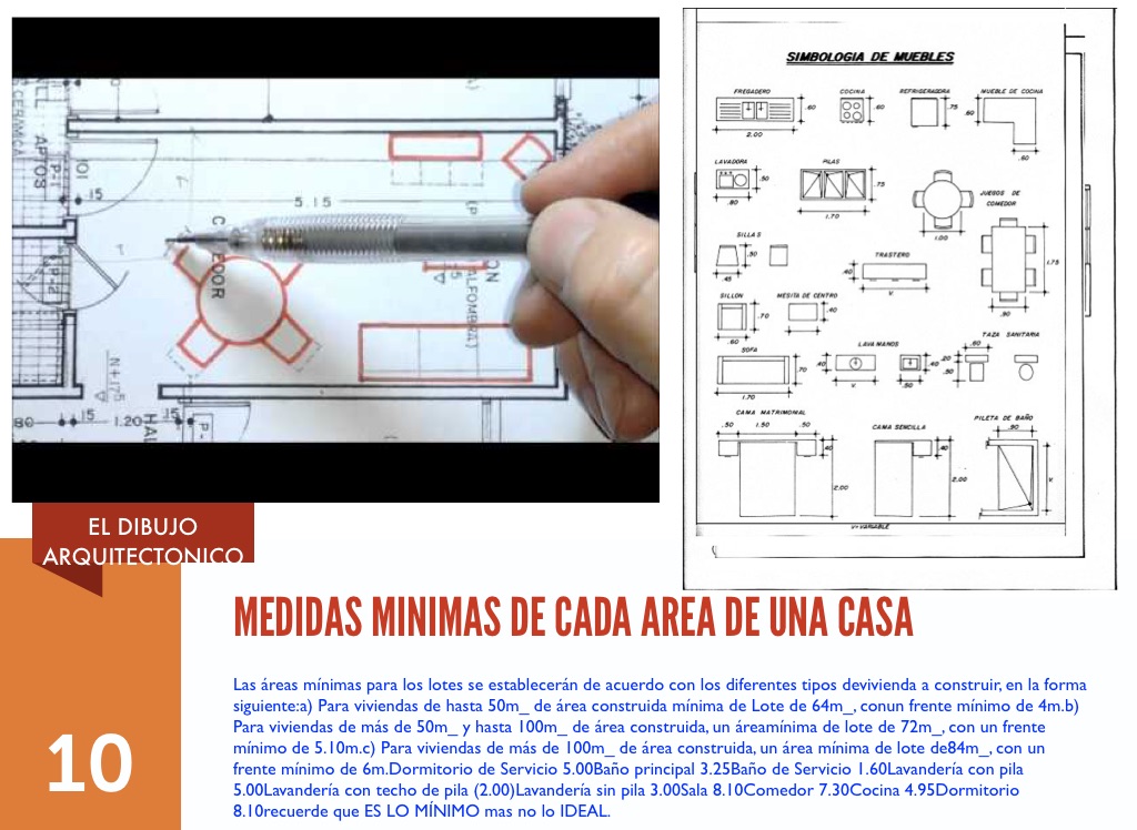 Las áreas mínimas para los lotes se establecerán de acuerdo con los diferentes tipos devivienda a construir, en la forma siguiente:a) Para viviendas de hasta 50m_ de área construida mínima de Lote de 64m_, conun frente mínimo de 4m.b) Para viviendas de más de 50m_ y hasta 100m_ de área construida, un áreamínima de lote de 72m_, con un frente mínimo de 5.10m.c) Para viviendas de más de 100m_ de área construida, un área mínima de lote de84m_, con un frente mínimo de 6m.Dormitorio de Servicio 5.00Baño principal 3.25Baño de Servicio 1.60Lavandería con pila 5.00Lavandería con techo de pila (2.00)Lavandería sin pila 3.00Sala 8.10Comedor 7.30Cocina 4.95Dormitorio 8.10recuerde que ES LO MÍNIMO mas no lo IDEAL.