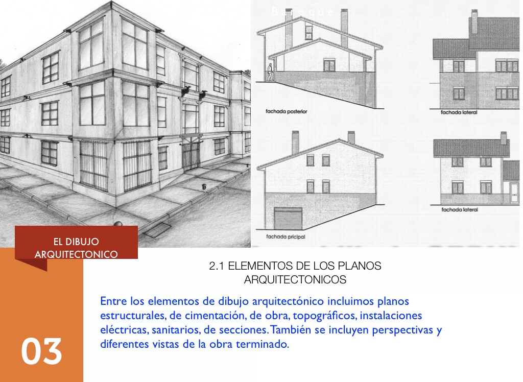 Entre los elementos de dibujo arquitectónico incluimos planos estructurales, de cimentación, de obra, topográficos, instalaciones eléctricas, sanitarios, de secciones. También se incluyen perspectivas y diferentes vistas de la obra terminado.