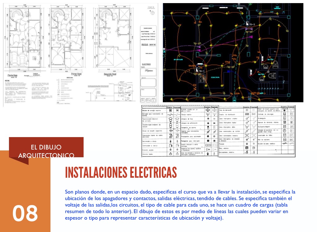 Son planos donde, en un espacio dado, especificas el curso que va a llevar la instalación, se especifica la ubicación de los apagadores y contactos, salidas eléctricas, tendido de cables. Se especifica también el voltaje de las salidas,los circuitos, el tipo de cable para cada uno, se hace un cuadro de cargas (tabla resumen de todo lo anterior). El dibujo de estos es por medio de líneas las cuales pueden variar en espesor o tipo para representar características de ubicación y voltaje).