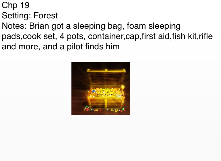 Notes: Brian got a sleeping bag, foam sleeping pads,cook set, 4 pots, container,cap,first aid,fish kit,rifle and more, and a pilot finds him