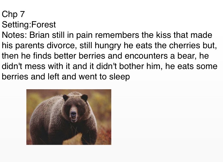 Notes: Brian still in pain remembers the kiss that made his parents divorce, still hungry he eats the cherries but, then he finds better berries and encounters a bear, he didn't mess with it and it didn't bother him, he eats some berries and left and went to sleep