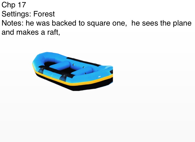 Notes: he was backed to square one, he sees the plane and makes a raft,