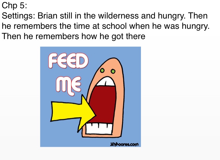 Settings: Brian still in the wilderness and hungry. Then he remembers the time at school when he was hungry. Then he remembers how he got there