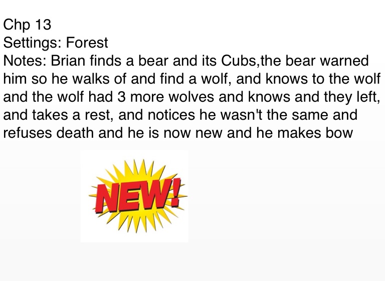 Notes: Brian finds a bear and its Cubs,the bear warned him so he walks of and find a wolf, and knows to the wolf and the wolf had 3 more wolves and knows and they left, and takes a rest, and notices he wasn't the same and refuses death and he is now new and he makes bow