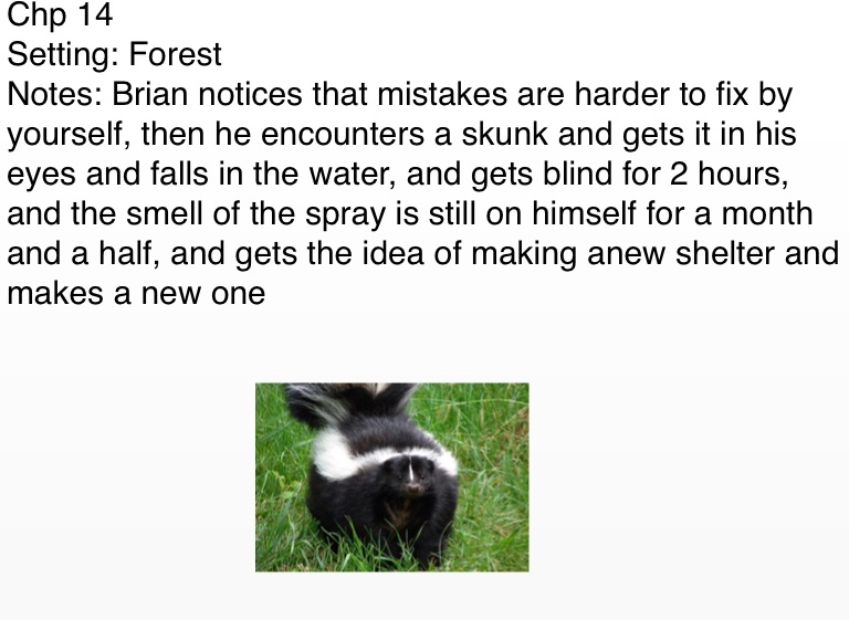 Notes: Brian notices that mistakes are harder to fix by yourself, then he encounters a skunk and gets it in his eyes and falls in the water, and gets blind for 2 hours, and the smell of the spray is still on himself for a month and a half, and gets the idea of making anew shelter and makes a new one