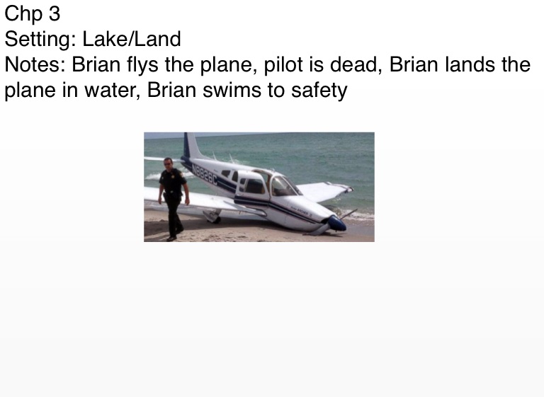 Notes: Brian flys the plane, pilot is dead, Brian lands the plane in water, Brian swims to safety