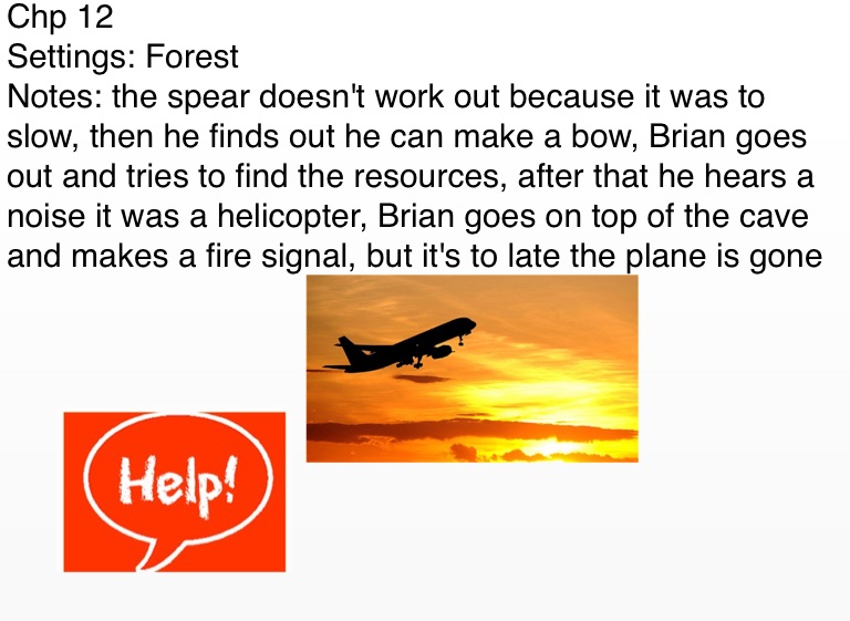 Notes: the spear doesn't work out because it was to slow, then he finds out he can make a bow, Brian goes out and tries to find the resources, after that he hears a noise it was a helicopter, Brian goes on top of the cave and makes a fire signal, but it's to late the plane is gone