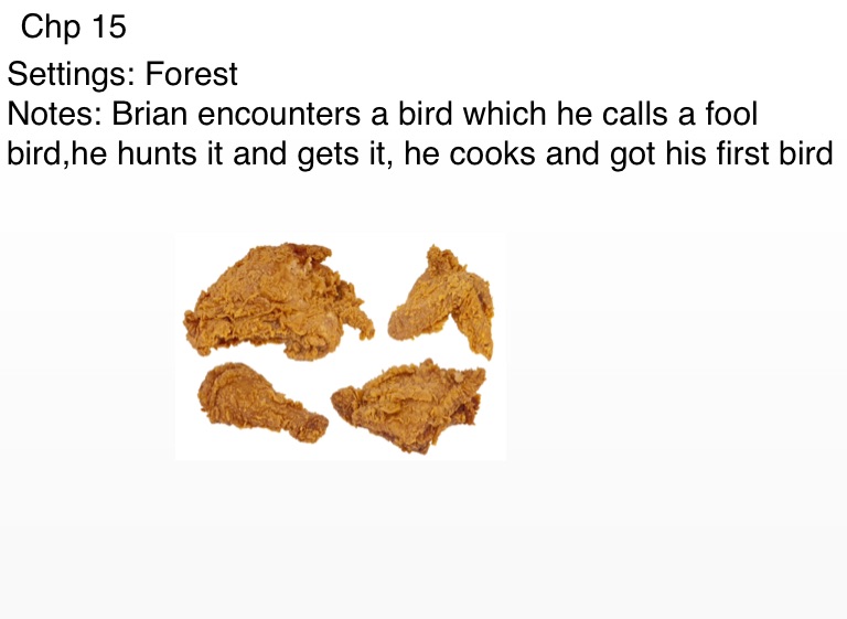 Notes: Brian encounters a bird which he calls a fool bird,he hunts it and gets it, he cooks and got his first bird