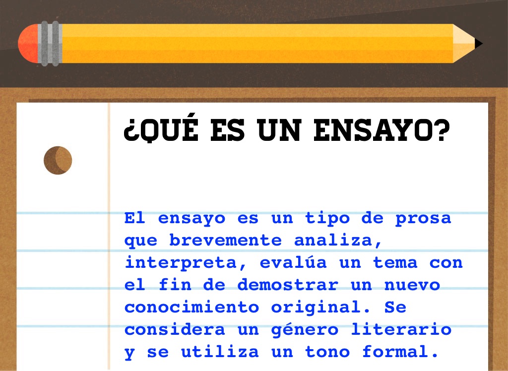 El ensayo es un tipo de prosa que brevemente analiza, interpreta, evalúa un tema con el fin de demostrar un nuevo conocimiento original. Se considera un género literario y se utiliza un tono formal.