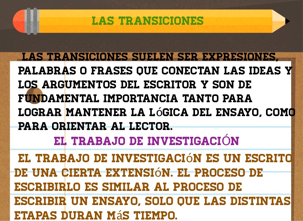 Las transiciones suelen ser expresiones, palabras o frases que conectan las ideas y los argumentos del escritor y son de fundamental importancia tanto para lograr mantener la lógica del ensayo, como para orientar al lector.