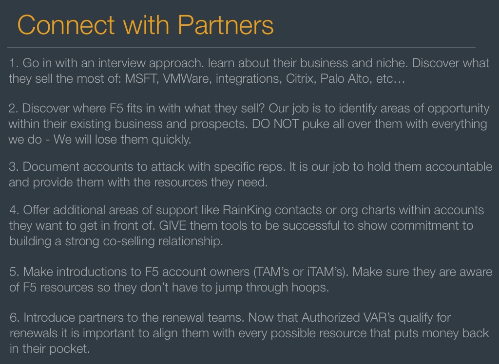 2. Discover where F5 fits in with what they sell? Our job is to identify areas of opportunity within their existing business and prospects. DO NOT puke all over them with everything we do - We will lose them quickly.