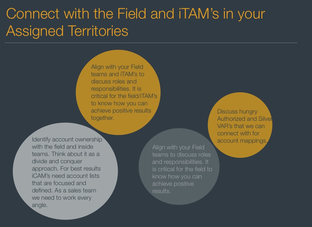 Align with your Field teams and iTAM’s to discuss roles and responsibilities. It is critical for the field/iTAM’s to know how you can achieve positive results together.