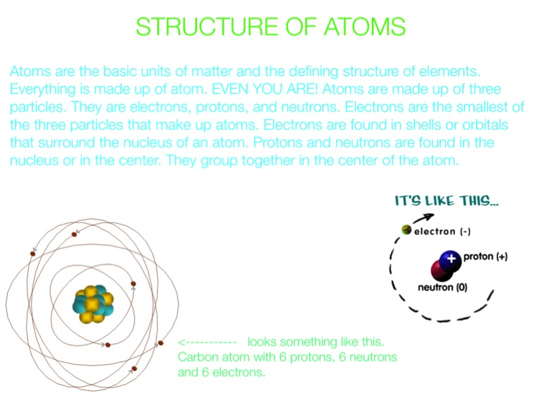 Atoms are the basic units of matter and the defining structure of elements. Everything is made up of atom. EVEN YOU ARE! Atoms are made up of three particles. They are electrons, protons, and neutrons. Electrons are the smallest of the three particles that make up atoms. Electrons are found in shells or orbitals that surround the nucleus of an atom. Protons and neutrons are found in the nucleus or in the center. They group together in the center of the atom.