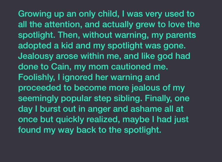 Growing up an only child, I was very used to all the attention, and actually grew to love the spotlight. Then, without warning, my parents adopted a kid and my spotlight was gone. Jealousy arose within me, and like god had done to Cain, my mom cautioned me. Foolishly, I ignored her warning and proceeded to become more jealous of my seemingly popular step sibling. Finally, one day I burst out in anger and ashame all at once but quickly realized, maybe I had just found my way back to the spotlight.