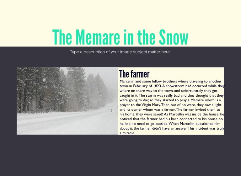 Marcellin and some fellow brothers where traveling to another town in February of 1823. A snowstorm had occurred while they where on there way to the town, and unfortunately, they got caught in it. The storm was really bad and they thought that they were going to die; so they started to pray a Memare which is a prayer to the Virgin Mary. Then out of no were, they saw a light and its owner whom was a farmer. The farmer invited them to his home; they were saved! As Marcellin was inside the house, he noticed that the farmer had his barn connected to his house, so he had no need to go outside. When Marcellin questioned him about it, the farmer didn't have an answer. This incident was truly a miracle.