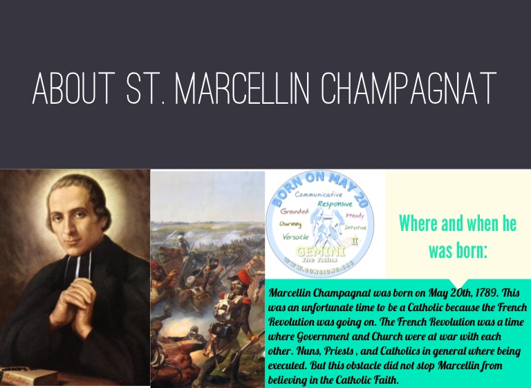 Marcellin Champagnat was born on May 20th, 1789. This was an unfortunate time to be a Catholic because the French Revolution was going on. The French Revolution was a time where Government and Church were at war with each other. Nuns, Priests , and Catholics in general where being executed. But this obstacle did not stop Marcellin from believing in the Catholic Faith.