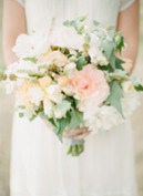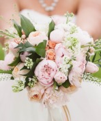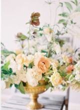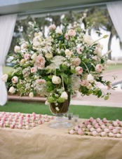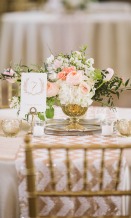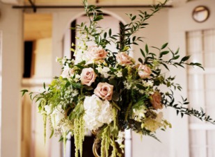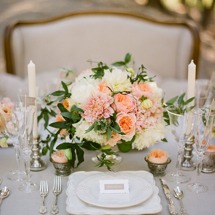 Personal flowers are to feel romantic and lavish. Blush yet neutral toned blooms such as ranunculus, garden roses, lisianthus, tea roses etc. The place card table will feature and elegant tall centerpiece giving a luxurious first impression with moss around wooden boxes for the champagne favors to be displayed. Centerpieces will be two collaborative designs. The first will be a large and wide arrangement low to the table that spills out across the tables creating a garland of sorts that becomes simpler towards the ends of the table. The other design will incorporate two arrangements nestled between pillar candles atop of mercury candle holders. Using silver vases, mercury glass and wood materials will offer a rich feeling.