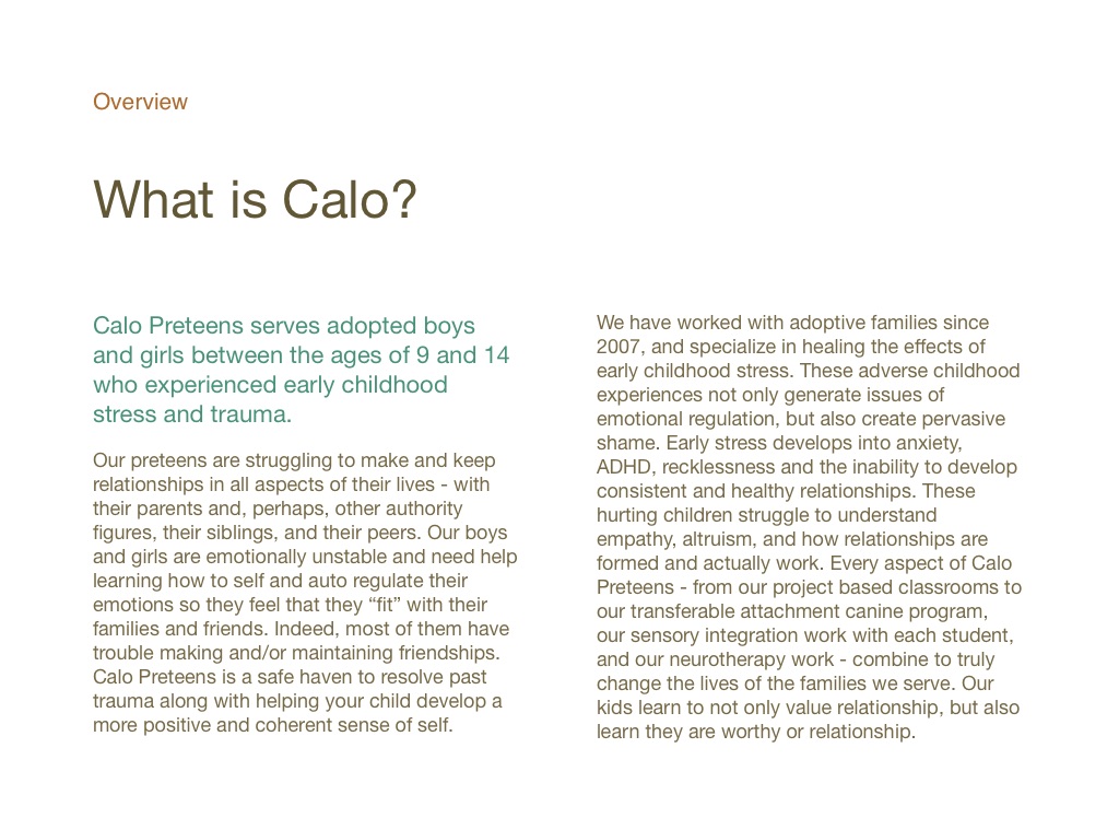We have worked with adoptive families since 2007, and specialize in healing the effects of early childhood stress. These adverse childhood experiences not only generate issues of emotional regulation, but also create pervasive shame. Early stress develops into anxiety, ADHD, recklessness and the inability to develop consistent and healthy relationships. These hurting children struggle to understand empathy, altruism, and how relationships are formed and actually work. Every aspect of Calo Preteens - from our project based classrooms to our transferable attachment canine program, our sensory integration work with each student, and our neurotherapy work - combine to truly change the lives of the families we serve. Our kids learn to not only value relationship, but also learn they are worthy or relationship.