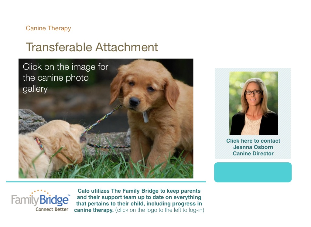 Calo utilizes The Family Bridge to keep parents and their support team up to date on everything that pertains to their child, including progress in canine therapy. (click on the logo to the left to log-in)