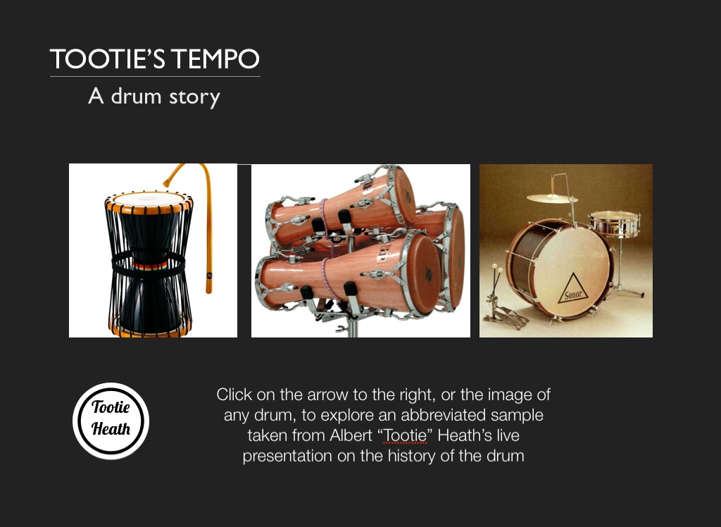 Click on the arrow to the right, or the image of any drum, to explore an abbreviated sample taken from Albert “Tootie” Heath’s live presentation on the history of the drum