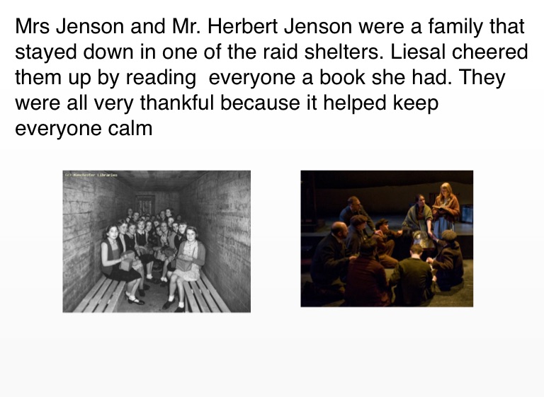 Mrs Jenson and Mr. Herbert Jenson were a family that stayed down in one of the raid shelters. Liesal cheered them up by reading everyone a book she had. They were all very thankful because it helped keep everyone calm
