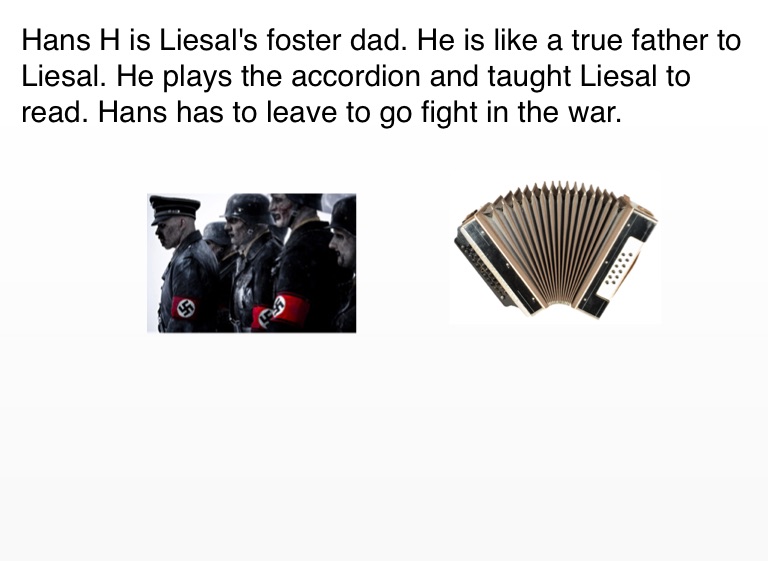 Hans H is Liesal's foster dad. He is like a true father to Liesal. He plays the accordion and taught Liesal to read. Hans has to leave to go fight in the war.