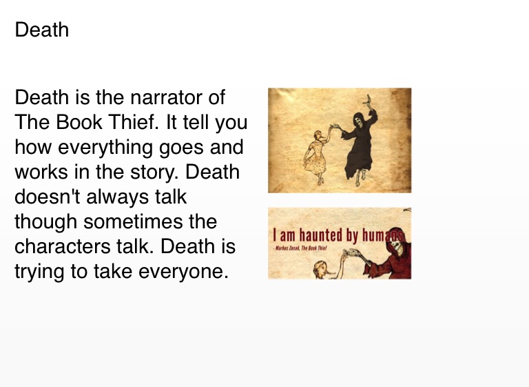 Death is the narrator of The Book Thief. It tell you how everything goes and works in the story. Death doesn't always talk though sometimes the characters talk. Death is trying to take everyone.