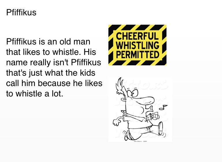 Pfiffikus is an old man that likes to whistle. His name really isn't Pfiffikus that's just what the kids call him because he likes to whistle a lot.