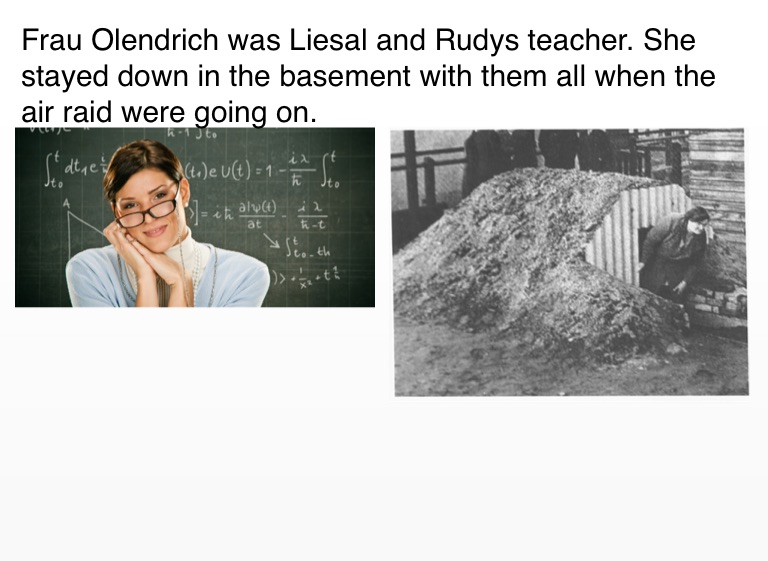 Frau Olendrich was Liesal and Rudys teacher. She stayed down in the basement with them all when the air raid were going on.