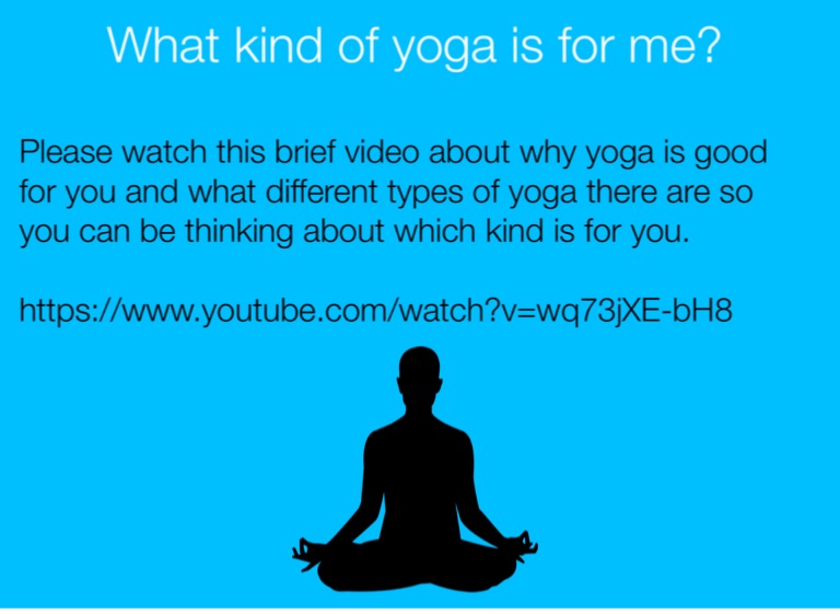 Please watch this brief video about why yoga is good for you and what different types of yoga there are so you can be thinking about which kind is for you.