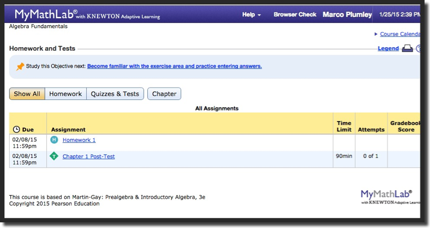 At this point you will enter your MyMathLab Homepage