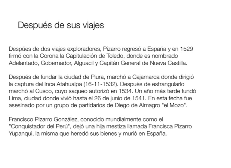 Despúes de dos viajes exploradores, Pizarro regresó a España y en 1529 firmó con la Corona la Capitulación de Toledo, donde es nombrado Adelantado, Gobernador, Alguacil y Capitán General de Nueva Castilla.