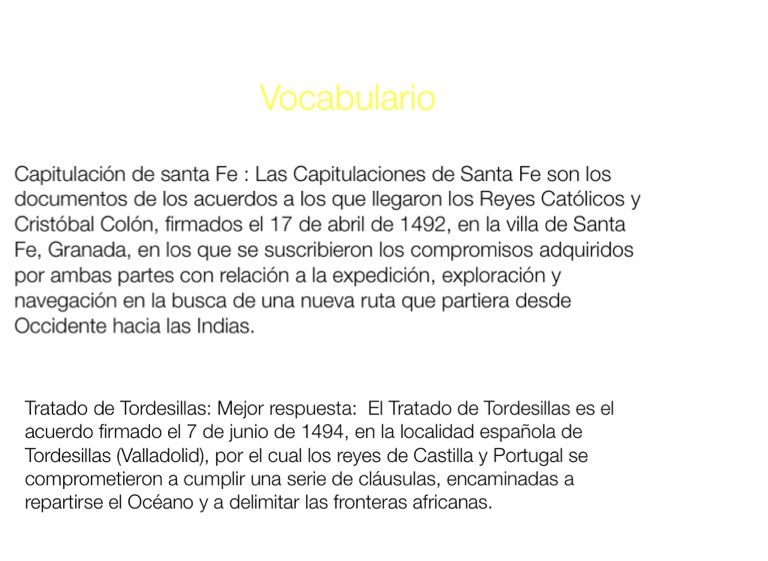 Capitulación de santa Fe : Las Capitulaciones de Santa Fe son los documentos de los acuerdos a los que llegaron los Reyes Católicos y Cristóbal Colón, firmados el 17 de abril de 1492, en la villa de Santa Fe, Granada, en los que se suscribieron los compromisos adquiridos por ambas partes con relación a la expedición, exploración y navegación en la busca de una nueva ruta que partiera desde Occidente hacia las Indias.