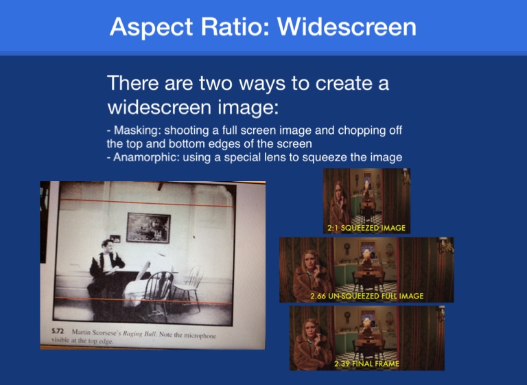 - Masking: shooting a full screen image and chopping off the top and bottom edges of the screen