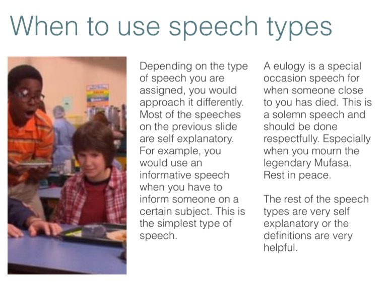 A eulogy is a special occasion speech for when someone close to you has died. This is a solemn speech and should be done respectfully. Especially when you mourn the legendary Mufasa. Rest in peace.
