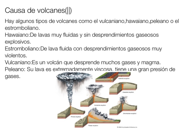 Hay algunos tipos de volcanes como el vulcaniano,hawaiano,peleano o el estromboliano.