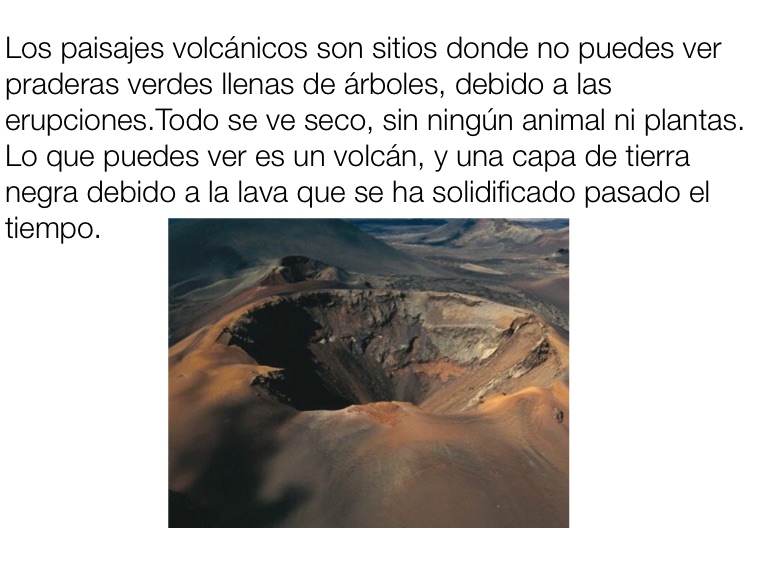 Los paisajes volcánicos son sitios donde no puedes ver praderas verdes llenas de árboles, debido a las erupciones.Todo se ve seco, sin ningún animal ni plantas. Lo que puedes ver es un volcán, y una capa de tierra negra debido a la lava que se ha solidificado pasado el tiempo.
