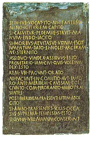 Queste tavole in bronzo recano incisioni dal valore giuridico, infatti costituisco il diritto romano. Il contenuto sanciva il potere assoluto del padre di famiglia sulla moglie e sui figli, ritenuti sue proprietà (al punto da consentirgli di vendere i figli) e confermavano il diritto di vendere come schiavi i debitori insolventi, proibivano i matrimoni tra patrizi e plebei.