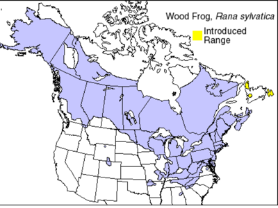 Wood frogs can grow 51 to 70mm in length. They are usually brown or tan colored. It is the only species of frog that has a dark eye mask. Wood frogs eat small invertebrates. They live in moist woodlands, swamps, around ponds, etc. They can survive freezing temperatures in the winter.