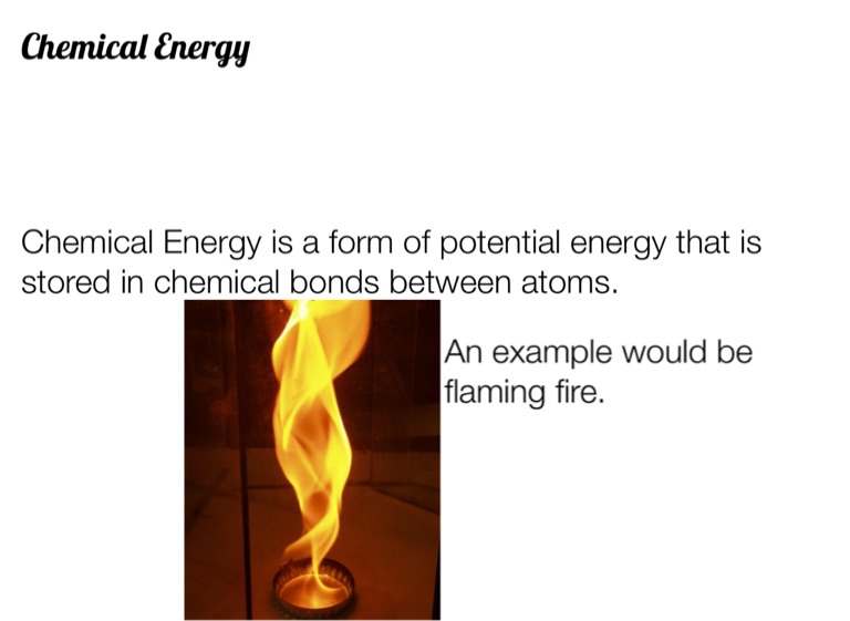 Chemical Energy is a form of potential energy that is stored in chemical bonds between atoms.