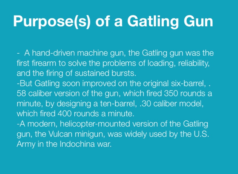 - A hand-driven machine gun, the Gatling gun was the first firearm to solve the problems of loading, reliability, and the firing of sustained bursts.