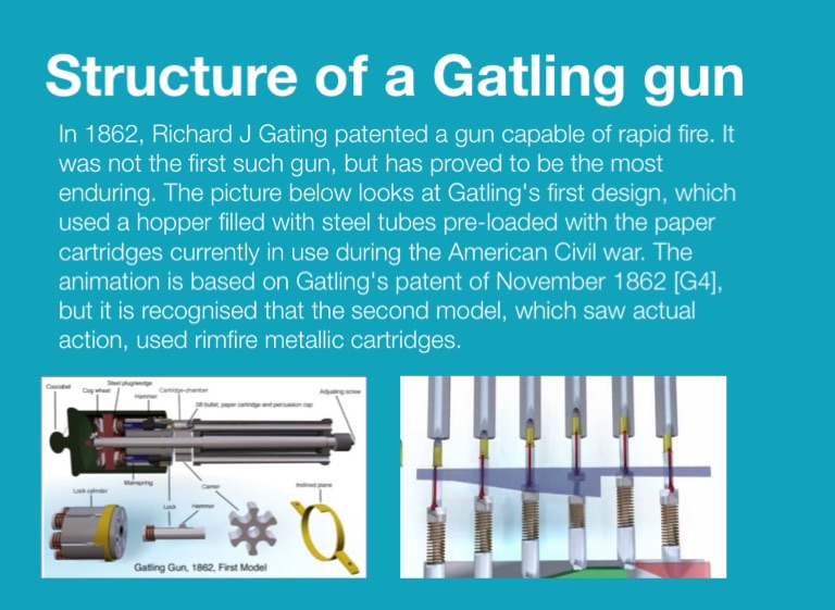 In 1862, Richard J Gating patented a gun capable of rapid fire. It was not the first such gun, but has proved to be the most enduring. The picture below looks at Gatling's first design, which used a hopper filled with steel tubes pre-loaded with the paper cartridges currently in use during the American Civil war. The animation is based on Gatling's patent of November 1862 [G4], but it is recognised that the second model, which saw actual action, used rimfire metallic cartridges.