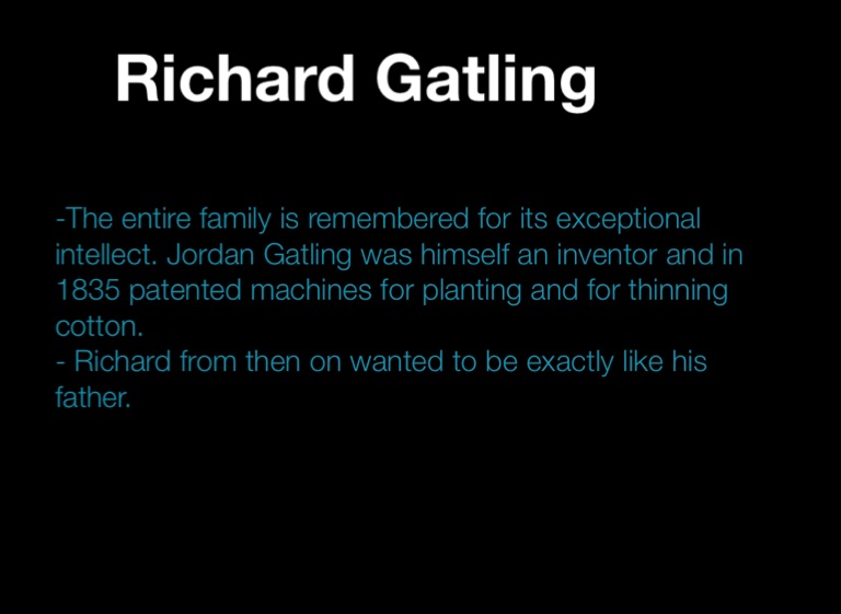 -The entire family is remembered for its exceptional intellect. Jordan Gatling was himself an inventor and in 1835 patented machines for planting and for thinning cotton.
