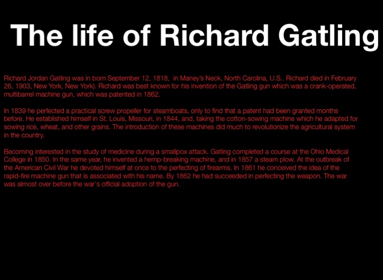 Richard Jordan Gatling was in born September 12, 1818, in Maney’s Neck, North Carolina, U.S.. Richard died in February 26, 1903, New York, New York). Richard was best known for his invention of the Gatling gun which was a crank-operated, multibarrel machine gun, which was patented in 1862.