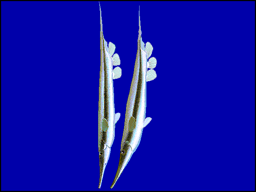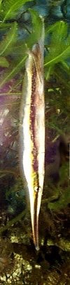 Description: vertical swimmers (unless startled), pointed nose and tail, stripe that runs the length of its body.