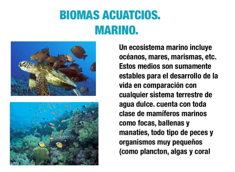 Un ecosistema marino incluye océanos, mares, marismas, etc. Estos medios son sumamente estables para el desarrollo de la vida en comparación con cualquier sistema terrestre de agua dulce. cuenta con toda clase de mamíferos marinos como focas, ballenas y manatíes, todo tipo de peces y organismos muy pequeños (como plancton, algas y coral