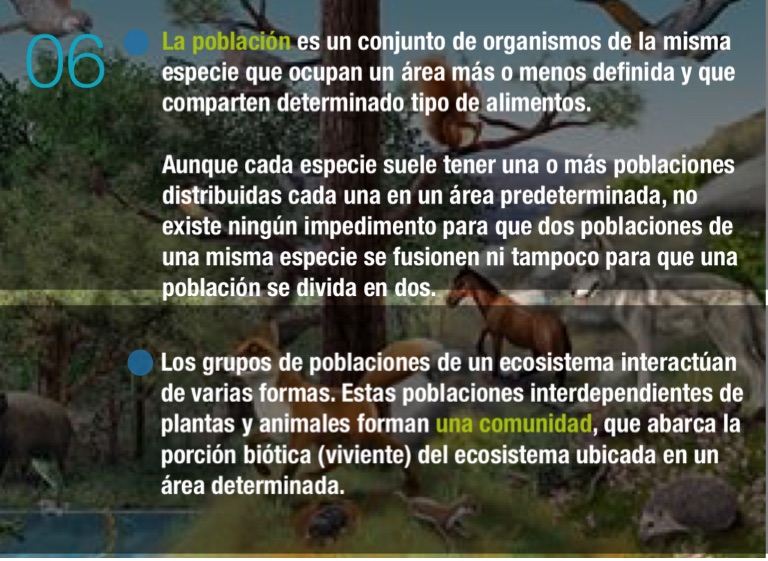 La población es un conjunto de organismos de la misma especie que ocupan un área más o menos definida y que comparten determinado tipo de alimentos.