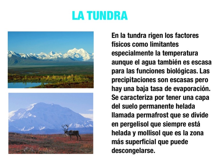En la tundra rigen los factores físicos como limitantes especialmente la temperatura aunque el agua también es escasa para las funciones biológicas. Las precipitaciones son escasas pero hay una baja tasa de evaporación. Se caracteriza por tener una capa del suelo permanente helada llamada permafrost que se divide en pergelisol que siempre está helada y mollisol que es la zona más superficial que puede descongelarse.