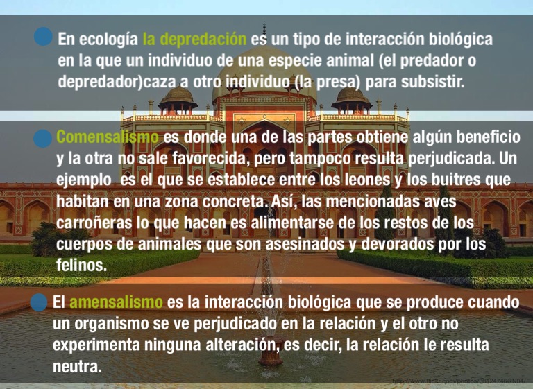 Comensalismo es donde una de las partes obtiene algún beneficio y la otra no sale favorecida, pero tampoco resulta perjudicada. Un ejemplo es el que se establece entre los leones y los buitres que habitan en una zona concreta. Así, las mencionadas aves carroñeras lo que hacen es alimentarse de los restos de los cuerpos de animales que son asesinados y devorados por los felinos.