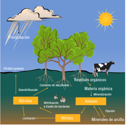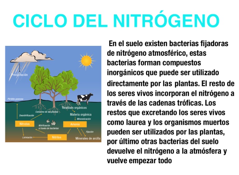 En el suelo existen bacterias fijadoras de nitrógeno atmosférico, estas bacterias forman compuestos inorgánicos que puede ser utilizado directamente por las plantas. El resto de los seres vivos incorporan el nitrógeno a través de las cadenas tróficas. Los restos que excretando los seres vivos como laurea y los organismos muertos pueden ser utilizados por las plantas, por último otras bacterias del suelo devuelve el nitrógeno a la atmósfera y vuelve empezar todo